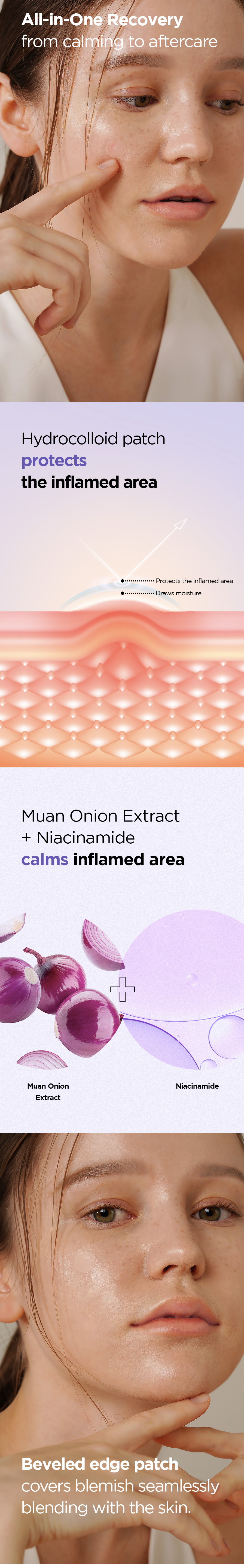 - Soin des imperfections : Chaque patch contient un extrait d’oignon rouge (Allium Cepa) à haute concentration, reconnu pour ses propriétés anti-inflammatoires et antibactériennes, afin de réduire efficacement les imperfections et prévenir de nouvelles éruptions.